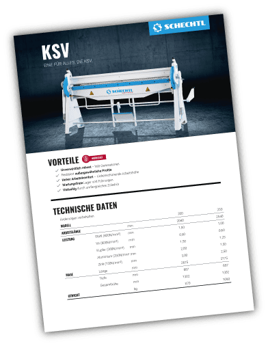 Die Schechtl KSV ist die verstärkte Version der KS und auch in 2540 mm Arbeitslänge erhältlich. Die Oberwange besteht aus Walzprofilen, die Unter- und Biegewange aus einer Stahlkonstruktion. Die umfangreichen Zubehöroptionen und vielseitigen Einstellmöglichkeiten machen die KSV zur ultimativen Maschine für das Spenglerhandwerk.