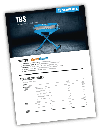 Die Schechtl TBS ist die kleinste der manuellen Segment-Schwenkbiegemaschinen, aber ganz groß was ihre Flexibilität auf der Baustelle betrifft. Dank ihrer geringen Abmessungen bewegst du die TBS mühelos auf Baustellen - zwischen Stockwerken, auf dem Baugerüst und in engen Räumen. Zudem ist die Montage der TBS auf einer Werkbank oder in einem Baufahrzeug möglich.